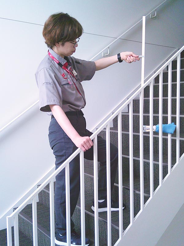 エスカレーターに乗りながら側壁を除塵できる完全オリジナルな清掃用具。旧型を改良し、コンパクト、軽量化に成功。フラットモップに変えたことで、脱着の手間も改善。従前よりも安全で、作業姿勢も良くなった。