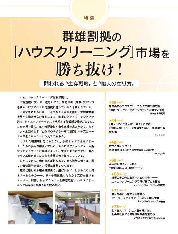 2026年1月号の特集は、「技術はあるのに稼げない」そんな悩みに終止符を。1兆円市場へ急成長するハウスクリーニング業界の「生存戦略」を完全網羅! いま、ハウスクリーニング市場は「生活インフラ」へと進化し、かつてないバブルを迎えています。しかし、その裏で起きているのは、大手FC、独立系、そしてマッチングプラットフォーム入り乱れての「過酷な価格競争」です。